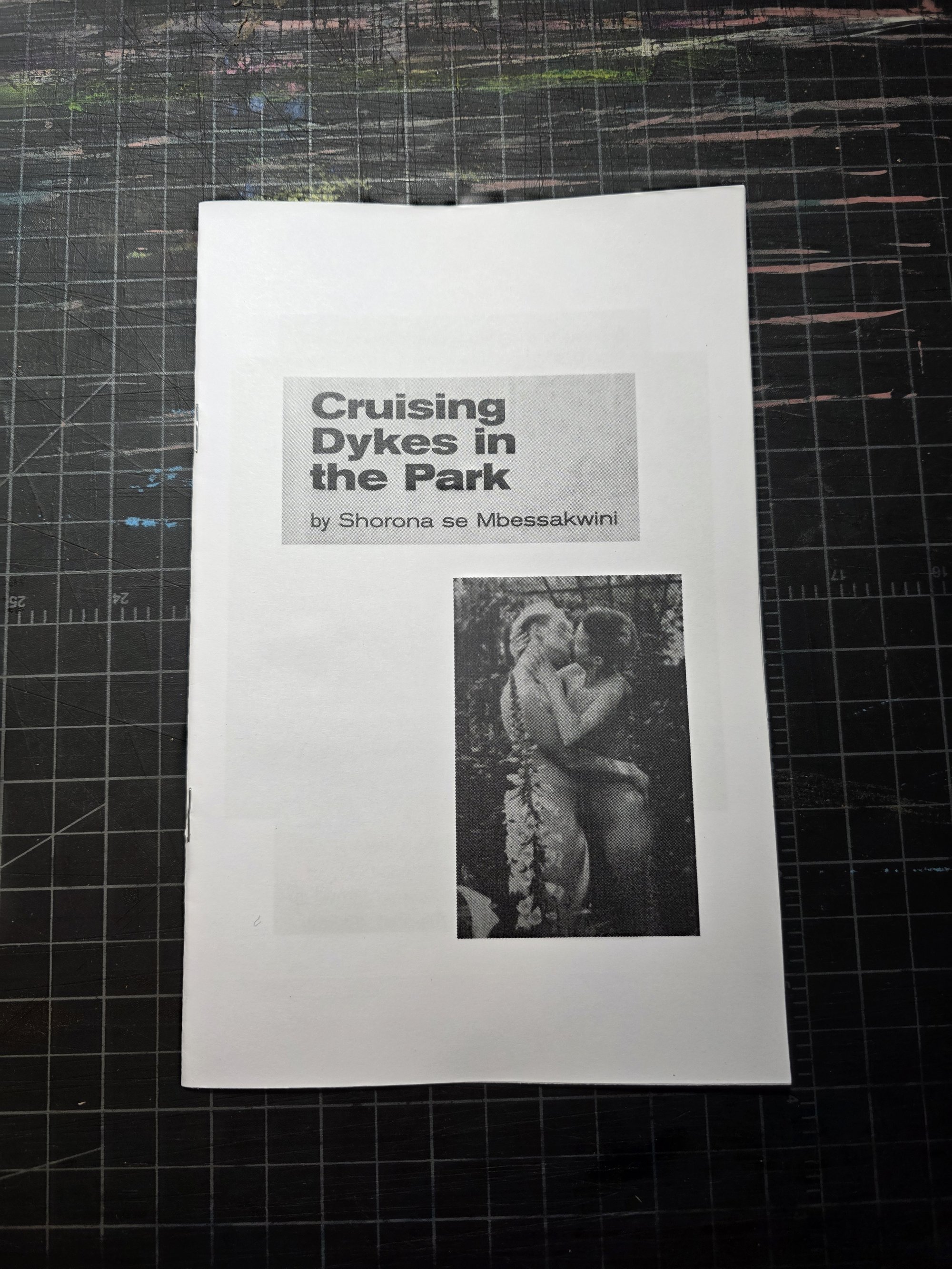 A paper copy of a zine that comes from my archival work with T Slur Collective. I've taken the story "Cruising Dykes in the Park" by Shorona se Mbessakwini and related photos from various issues of On Our Backs and combined them in a zine format.